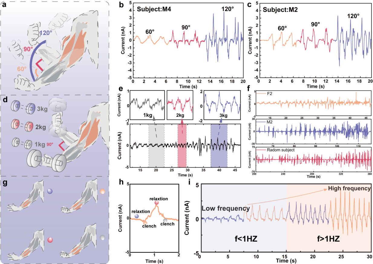 研究团队提出了一种新型的摩擦电纳米发电机模块化肌肉传感器(MMS-TENG),该传感器由柔性导电海绵、聚氨酯、氟化乙烯丙烯薄膜和尼龙弹性绷带制成,可固定在人体躯干上。得益于传感器中导电海绵和聚氨酯海绵的三维网格结构,它具有可调节的灵敏度功能,可根据锻炼模式和测量位置进行调整。传感器通过弹性带固定在被测部件上,最小分辨率为0.001牛顿,响应延迟仅为2毫秒,最小频率为0.1赫兹。在360,000次循环测试中,传感器的电流输出表现出良好的稳定性。MMS-TENG能够有效捕捉与肌肉拉伸和震颤相关的信号,因此在个人健身和健康管理方面具有巨大潜力,如纠正训练姿势、收集骑行数据以及监测疲劳显示等。
