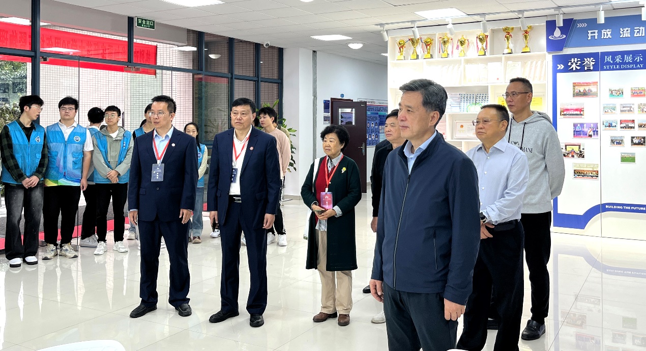 在学生科技作品展览区,周旬认真观看了物电学子自主设计、制作的各类科技成果,对同学们的实践动手能力表示肯定和赞赏。
