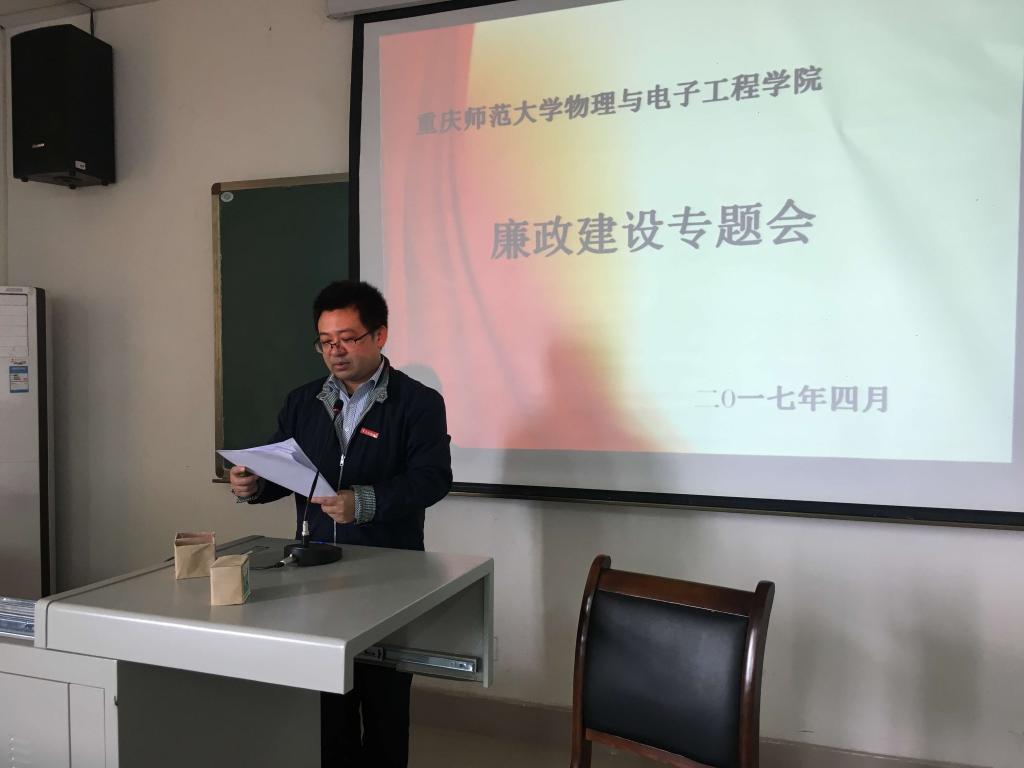 党风廉政建设专题会在531会议室顺利举行。学院党委书记唐敏、院长崔玉亭、党委副书记兼纪委书记冉久飞、副院长曾毅出席专题会。物电学院全体党员及教职员工参加会议。