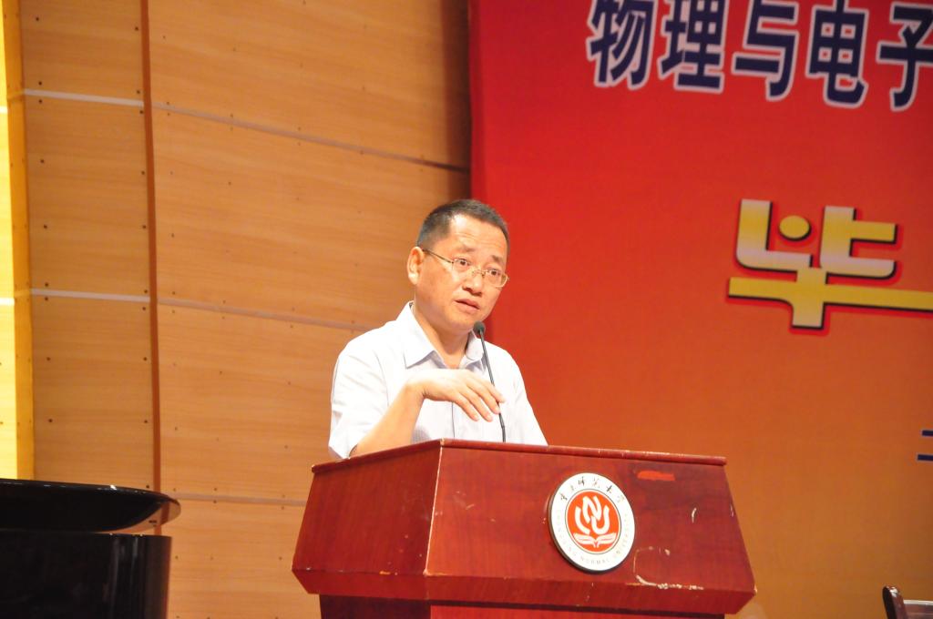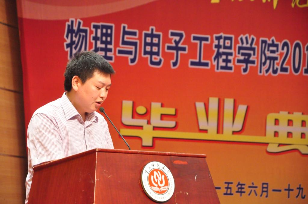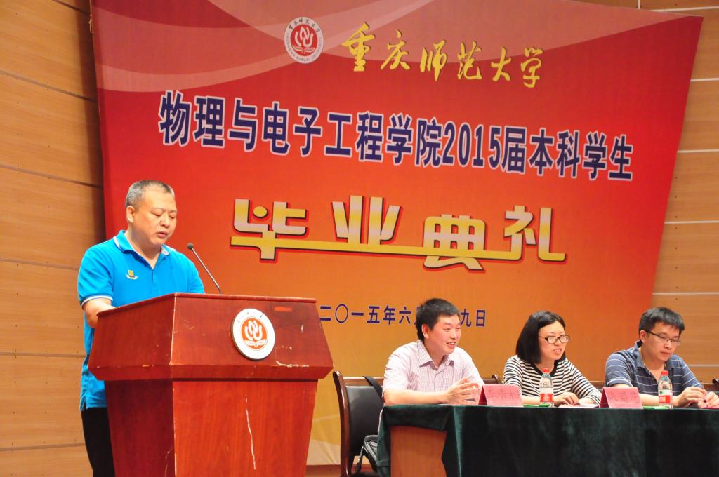 毕业生代表发言后,冯庆教授代表物电学院全体教师发言,他表达了全体教师对2015届毕业生顺利毕业的祝贺和对未来的祝福。随后便是以马良为代表的低年级同学们献词,表达了对学姐学长们的祝福之情。接着,物电学院院长崔玉亭教授为毕业生们致辞,道出了学院对2015届毕业生们诚挚的祝福和期盼,并让即将离开校园的同学时刻记住重师“学高为师,身正为范”的优良校风,以此提醒自己约束自己。到这里,毕业典礼已经接近尾声,毕业生们向学院献礼,并全体起立高唱91吃瓜网