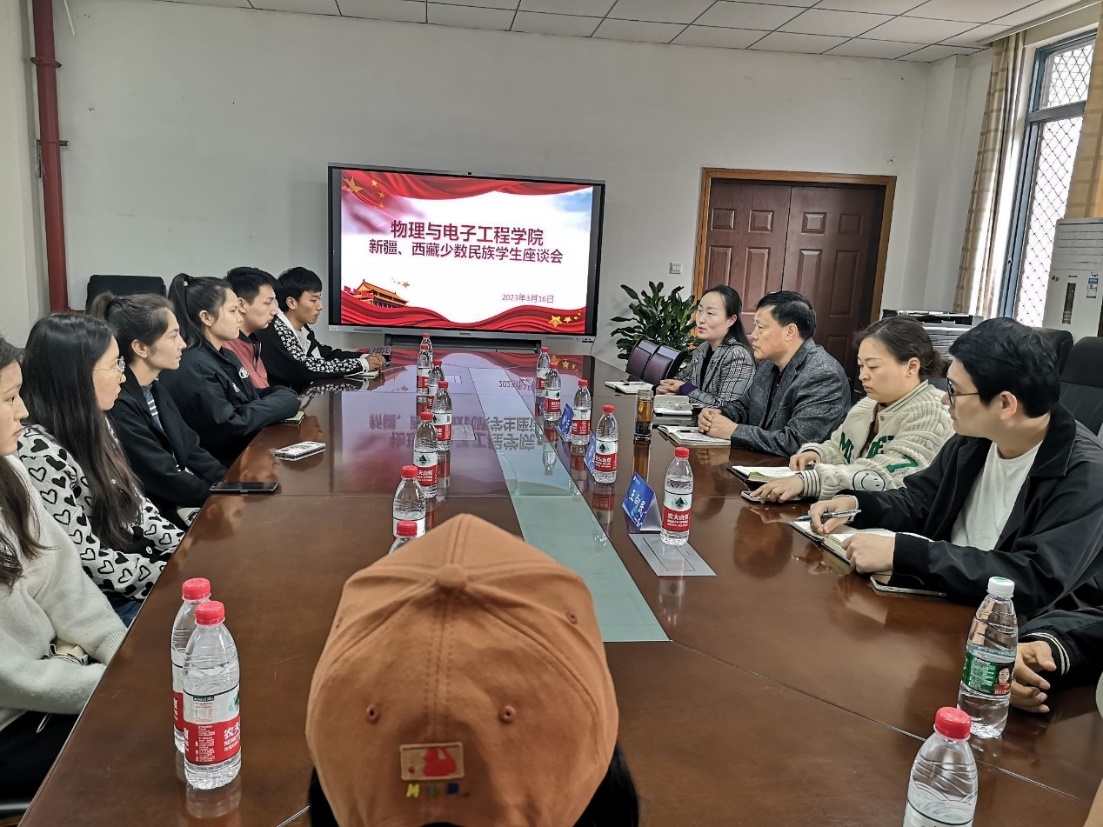 于3月16日在集贤楼524会议室召开新疆、西藏少数民族学生座谈会。物电学院党委书记杨云,党委副书记曾艳,各年级辅导员以及全体在校新疆、西藏少数民族学生参会。
