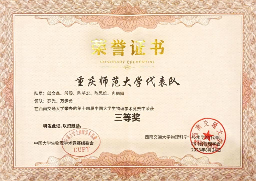 代表队(邱文鑫(队长)、殷殷、陈芋宏、陈思维、冉丽霞)在罗光、万步勇、张菊花、徐一宁四位老师的倾力指导下,于今年4月在西南地区大学生物理学术竞赛中获团体一等奖,作为代表队之一代表西南地区高校参加全国总决赛。物电学院参赛师生经过近半年的不懈努力和艰苦攻关,首次在中国大学生物理学术竞赛获得团体三等奖!