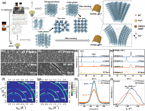 甲脒铅溴钙钛矿(FAPbBr3)凭借优异的光致发光量子产率和光学增益特性,被认为是激光增益材料的理想选择,在发光二极管、激光器等领域具有广阔应用前景。然而,传统制备方法面临体缺陷浓度高、机械可变形性不足等难题,严重制约了其在柔性光电子器件中的商业化应用。