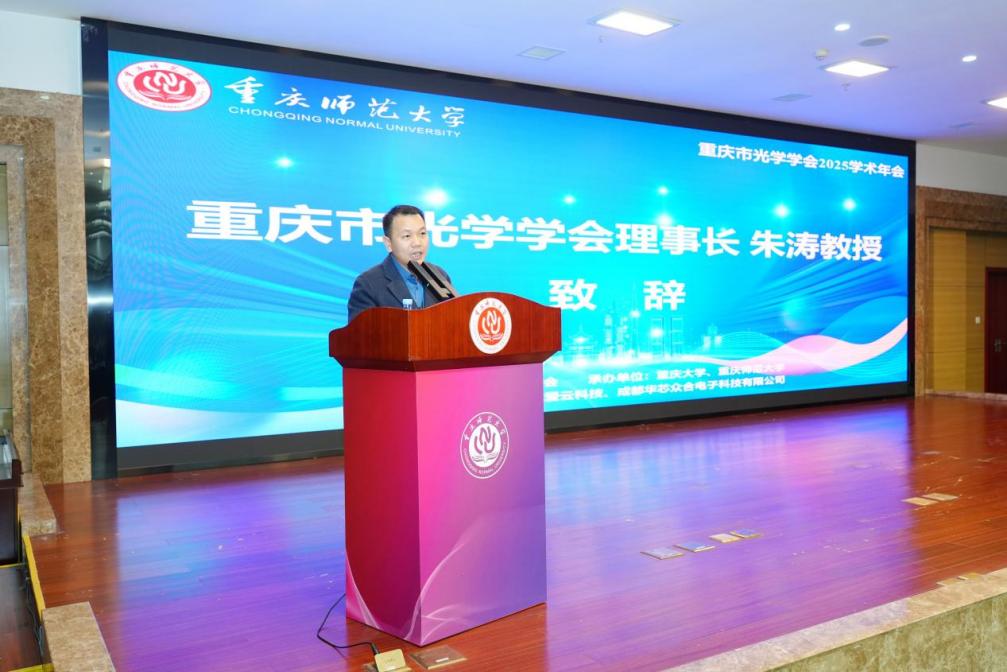 重庆市光学学会理事长朱涛教授发表致辞,他回顾了学会近年来在学术交流、学科建设、产学研融合等方面的工作成效。未来,学会将重点搭建产学研对接平台、打造特色奖项体系、建好国家级光学科普教育基地,共同书写重庆乃至西南地区光学事业发展的新篇章。