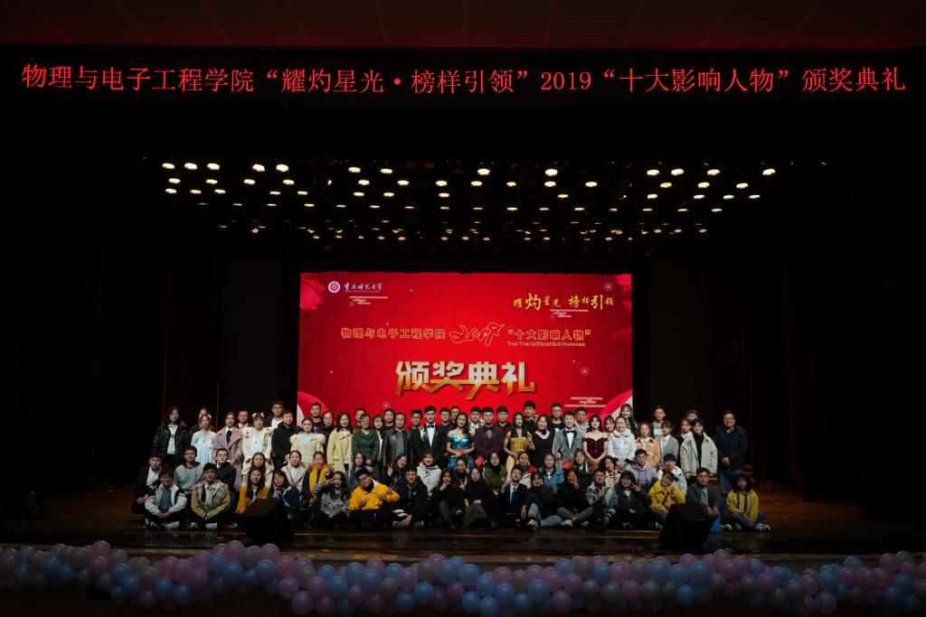 颁奖典礼上,到场各年级学生及莅临嘉宾共同观看了物电学院2019“十大影响人物”个人介绍片,了解了2019“十大影响人物”获奖同学在学业、科研、创新、创业、文体等方面追求卓越、逐梦前行的奋斗历程,听取了他们对物电学子的温暖寄语。随后,学校职能部门领导、学院领导及专业老师分别向2019“十大影响人物”获奖同学致颁奖词并向他们颁发奖杯及证书。