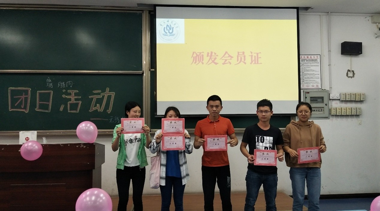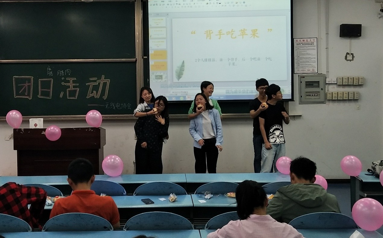活动开始,大家依次玩了一系列游戏,包括:“击鼓传球”、“蒙眼排序”、“背手吃苹果”等。其中激动人心的游戏:“击鼓传球”是一人拿气球,一人背着大家敲黑板,敲响传气球,敲响停止气球停止。气球在谁手中,谁就可以上台表演,这个环节幸运观众表演非常精彩,有唱歌、朗读、说特色方言的,都获得了大家的好评。中场休息环节,无线电干部进行歌唱表演,歌喉动人。稍后进行的游戏:“背手吃苹果”,积极上台的选手们一个个吃的飞快,争当第一的急迫模样让大家忍俊不禁,照下来都是表情包。欢乐过后,见证优秀成员的活动开始了,干事们颁发会员证和联动装置大赛奖状,各组优秀获奖选手领取奖状并合影纪念,到此活动圆满成功。