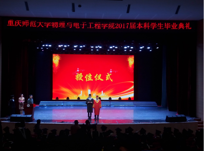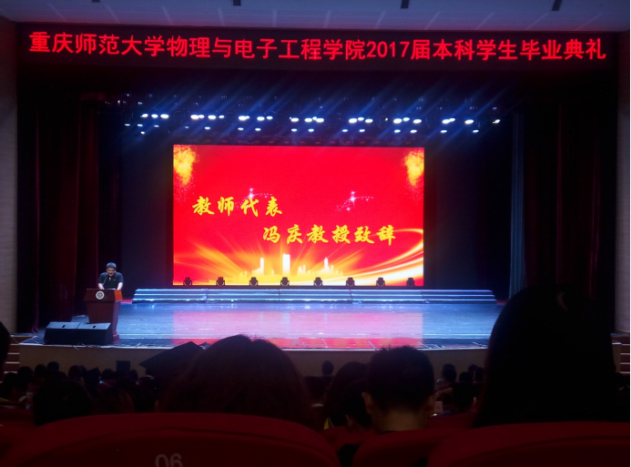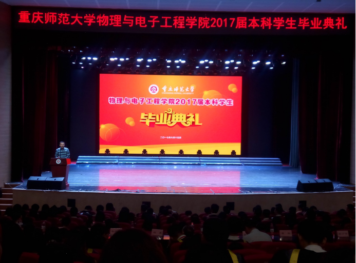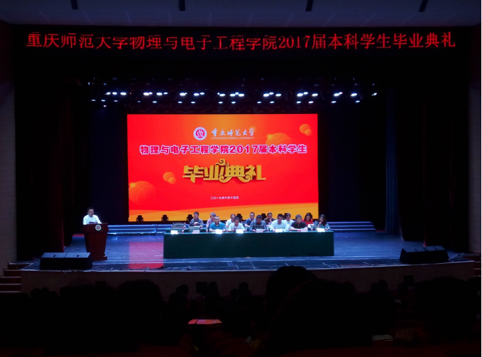在大家的一阵阵欢呼声中,学工部部长张志明教授走上台发言。张教授就大家四年内的优异表现进行总结,肯定了2017届毕业生们在学习上的努力与付出。他用“隆重、精彩、难忘”三个词形容了本次典礼,并谈到今天的典礼正处于重庆直辖市20周年的阶段,且意义非凡,而2017届的毕业生毕业后的第一个五年规划,正处于党的十八大提出两个“百年奋斗目标”的第一个建党一百年的阶段。张教授回顾了他20多年的工作经验,建议毕业生们在这个继往开来的过程中,要懂得“学会”。紧接着,毕业生代表任静饱含对学校、学院的感谢之情和同窗四年各奔天涯的不舍之情发言,讲出了毕业生们的心声。在重师,他们学习到了“学高为师、身正为范”的精髓所在;在物电学院,他们学到了“志存高远、脚踏实地”的成功秘诀。最后,院长崔玉亭教授致辞。崔院长表达了与同学即将分别的不舍,同时也展望未来,希望同学们以后能在自己的工作岗位上延续物电人的精神。无论未来多么坎坷重师物电永远是大家的家!