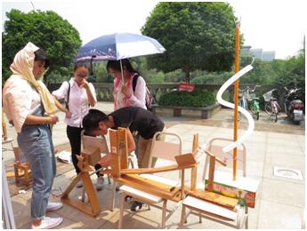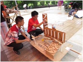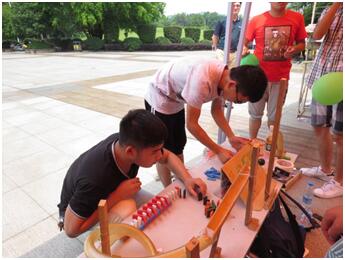 当日的气温颇高,但参赛选手们并没因此而倦怠,而是提前到场进行最后的调试,一遍遍摆正多米诺骨牌,一次次实验轨道,纵使炎炎烈日也挡不住追求完美的决心。比赛伊始,参赛团队向评委介绍本队的创意思路,接着便由选手们现场展示自己脑力与体力的结晶——联动装置。当手中的钢珠落下,一个又一个精彩的联动牵动着我们的内心,也引爆了我们的欢呼;一触即发的多米诺,创意爆棚的LED灯,梦幻十足的3D投影,节能环保的升旗设计快捷便利的浇花装置,每个装置都满怀参赛选手的创意和热情,他们奇思妙想也让人大开眼界。