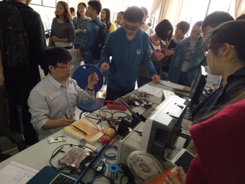 科技部于2016年4月7日星期四下午13点30分,在物电学院实验楼311室举办了电子科技大赛。罗海军老师、何传红老师及助评温开旭学长到现场评分并指导。