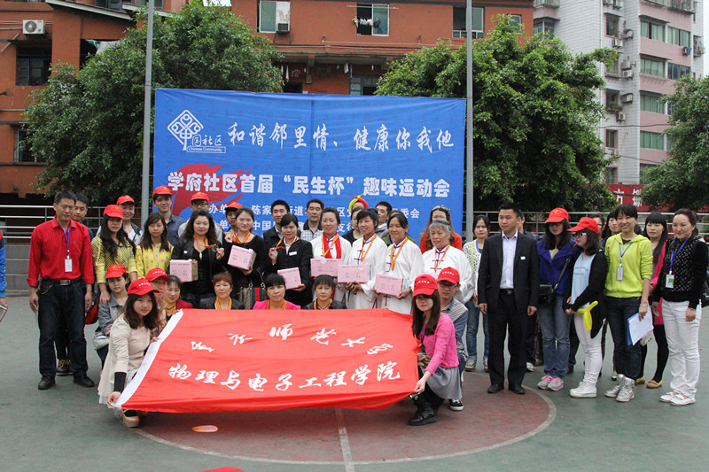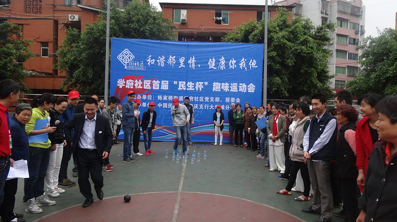 团总支·学生会、志愿者分队携手陈家桥街道学府社区当支部、居委会在学府社区广场举行以“和谐邻里情·健康你我他”为主题的“民生杯”迎五一趣味体育运动会。