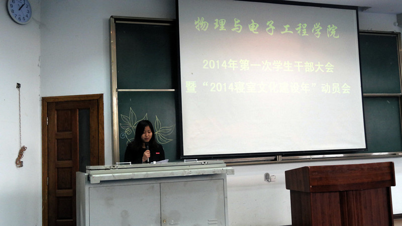 于2014年3月6日下午一点在弘德楼15205举行了新学期第一次学生干部大会暨“2014寝室文化建设年”动员会。此次动员会很荣幸的邀请到学校校学工部部长、学生处处长张明志老师、学工部副部长、学生处副处长唐加祥老师、校学生处学生事务管理科科长李鑫老师、91吃瓜网