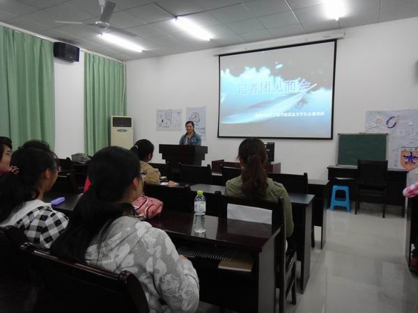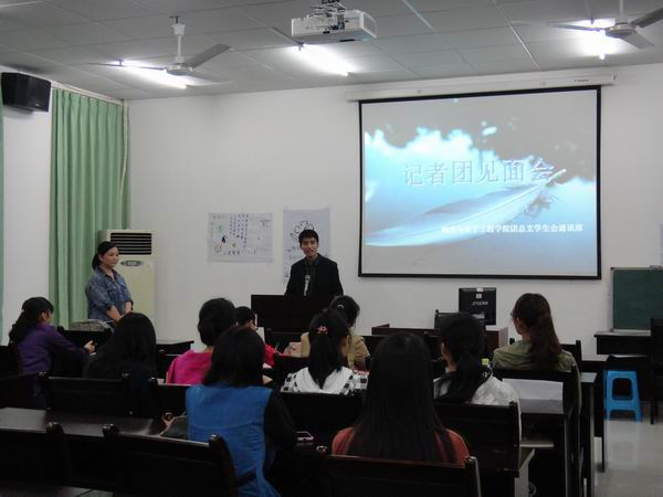 团总支·学生会2012-2013学年度第二学期学院“记者团”成立的任务,通讯部于10月18日(星期四)18:30在物电大楼501举办了记者团见面会,本次见面会由通讯部部长黄鸿雁主持,学院团总支·学生会主席张磊和副书记谭瑶前来助阵加油,以及通讯部副部长胡慧、罗逸雯、2012级各位新进干事及各班通讯委员悉数到场。