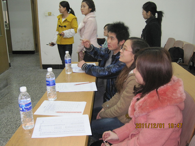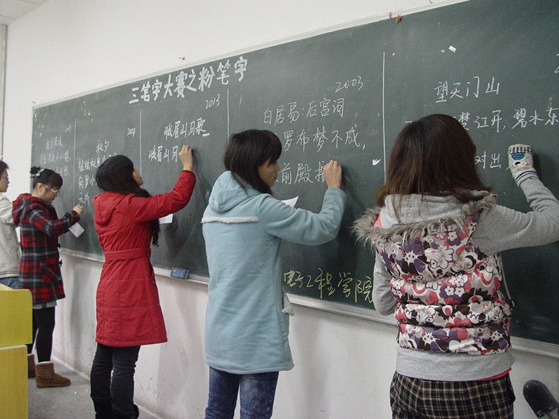 三笔字大赛在沙坪坝和大学城两个校区同时进行,大赛掀起了一场书万丈豪气,品传统精髓的轩然大波。此次大赛,来自两个赛区三个年级的同学积极的参与进来,参与人数超过280人次。本次比赛有幸邀请到2009级辅导员邓娜老师,2011级班主任蒋小平老师,团总支·学生会书记李佩,及马列部部长汪阳等学生会主要干部前来指导工作,同时邀请到原团总支宣传部部长罗晓,原办公室主任贾立平,原文艺部部长段美清,还有多次获得校书法比赛一等奖的赵树灵及在三笔字大赛中多次获得荣誉的李全朝、赵伯倩等同学来担任粉笔字现场评委。