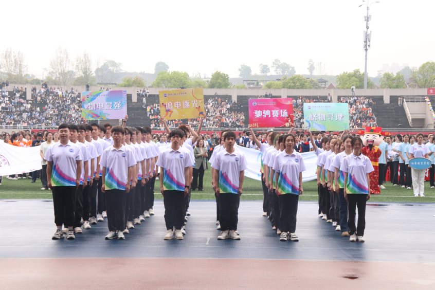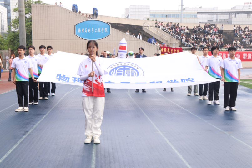 师生方阵身着统一服装,步伐矫健,神采飞扬,教职工手中的国旗迎风招展,学生们高举院牌,高喊“格物寻理,追电逐光,驰骋赛场,物电最强”,威武的口号掷地有声,彰显出物电师生坚定的信念与昂扬的斗志。更为引人注目的是,物电学子手举火箭模型,身穿宇航员服,展现出对科学探索的热爱与追求。近年来,物电学院在人才培养、教学科研、学科建设等方面取得累累硕果。全院师生齐心协力,为物理学专业申博工作努力拼搏,火箭模型象征着物电人一飞冲天的梦想。