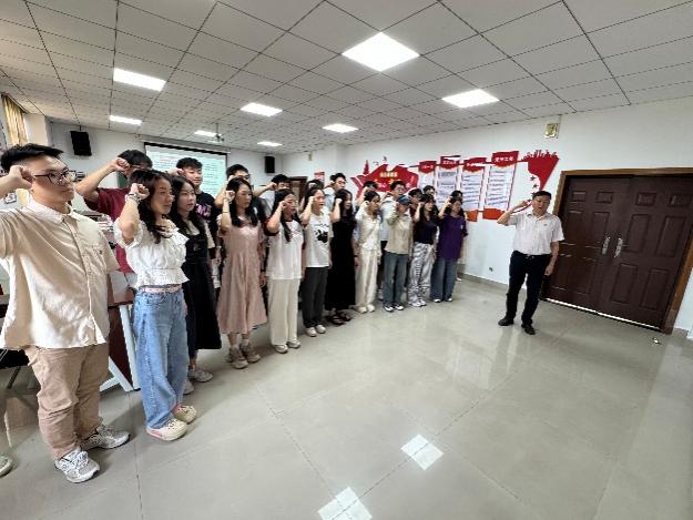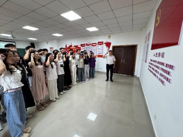会议第三项内容,重温入党誓词。全体起立,在杨云书记的带领下,面对党旗,全体毕业生党员庄严地重温入党誓词。“我志愿加入中国共产党,拥护党的纲领,遵守党的章程……”铮铮誓言,响彻整个会议室,回荡在每一位党员的心中,时刻提醒着他们不忘初心、牢记使命。