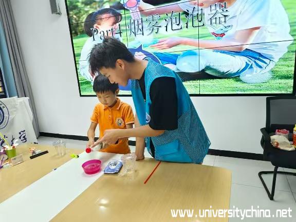 志愿者带领孩子完成“烟雾泡泡器”实验