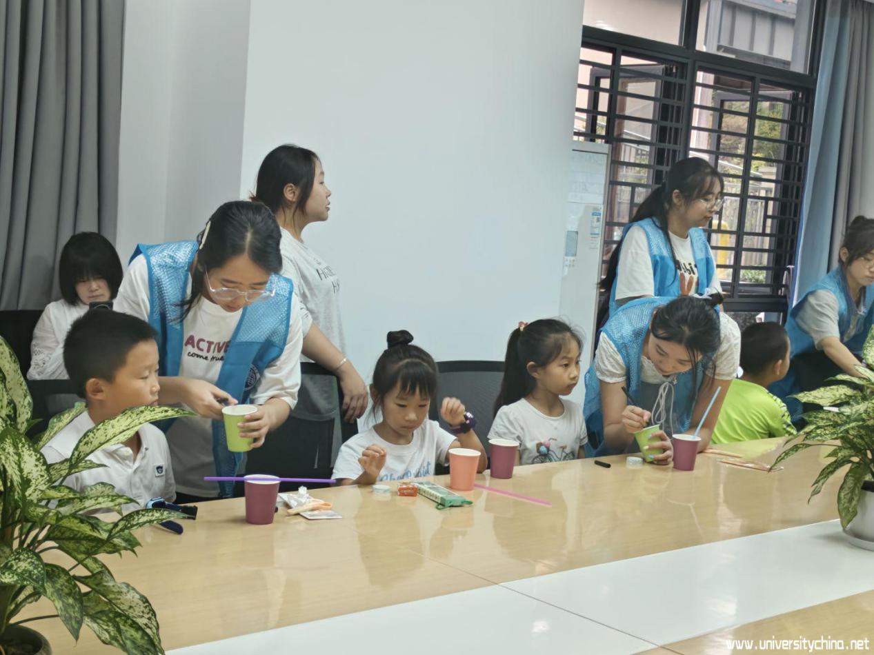 志愿者辅助小朋友完成“纸杯爪子”制作