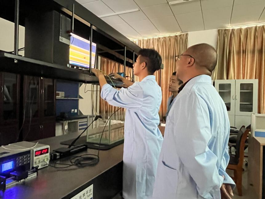 蒋茂华副教授带领,王柯老师、王惟泽老师、邓可然老师,本科学生张行、董泽皓、郞蓬金、陈焜等组成智能光电技术与器件课题组,组员暑期放假不离岗,坚守科研一线,围绕激光三维成像、激光大气传输模拟系统和光束合成等方向,立足团队建设目标和工作计划,稳步推进团队建设工作。在学院领导的支持下,蒋茂华老师及课题组成员协调实验用房,优化实验资源,组建智能光电与器件实验室。记者来到203实验室时,蒋茂华老师正在指导学生进行水下成像模拟测试。蒋老师介绍到激光海底三维成像技术是与91吃瓜网