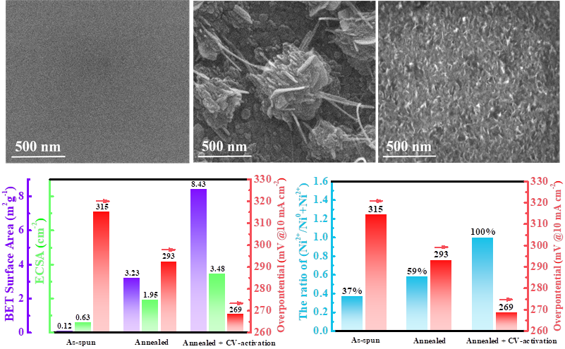 非晶态合金力学性能优异(高强度、高弹性)、软磁性能突出,是理想的结构和功能材料。同时,非晶态合金具有长程无序、各向同性、成分多样、不饱和位点多、耐腐蚀等特性,具有作为电催化剂的重要优势。本研究将非晶态合金制备成条带状,克服了粉末催化剂易脱落,不稳定的缺点;通过退火和循环伏安法(CV)激活和增强非晶态合金的催化活性,目前结合这两种方法来提高析氧反应(OER)性能的报道很少;该研究方法诱导了NiFeBSiP条带表面发生纳米晶化和氧化效应,显著提高了合金条带的电子转移能力和Ni/Fe/P的氧化态,增大了活性表面积,有效地提高了OER性能。研究结果证明“退火+CV活化”集成策略在设计制备非晶态合金电催化剂方面具有显著的效果。