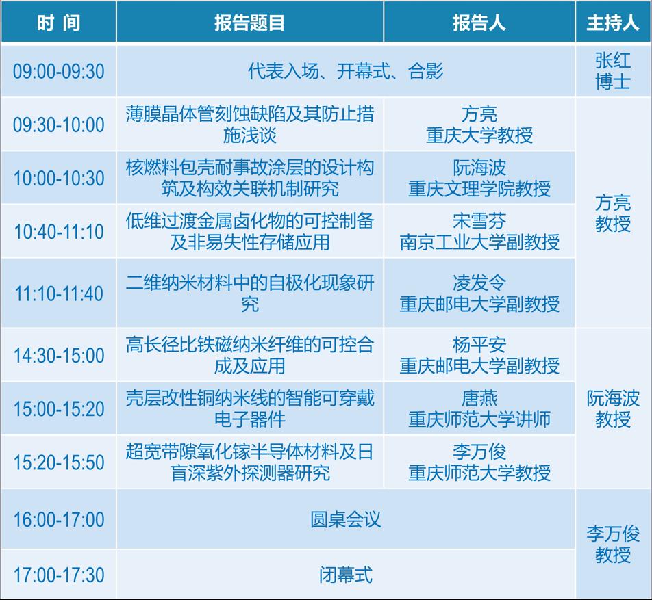 重庆大学方亮教授在报告中介绍了TFT叠层电极刻蚀缺陷的研究现状,并讨论其防止措施及相关科学问题;重庆文理学院阮海波教授以“核燃料包壳耐事故涂层问题的提出及研究现状”为题做专题报告,介绍其课题组在核燃料包壳耐事故涂层方面最新研究进展;南京工业大学的宋雪芬副教授介绍了低维过渡金属卤化物的可控制备及非易失性存储应用并分享其课题组在二维过渡金属卤化物及其在非易失性存储中的工作进展;重庆邮电大学凌发令副教授对二维纳米材料中的自极化现象对材料的电子结构、输运、表面活性等性质的影响做专题报告;重庆邮电大学杨平安副教授介绍了磁场辅助原位还原合成高长径比铁纳米线及包覆、轻质宽频带吸波涂层设计和柔性触觉传感器设计及应用;91吃瓜网