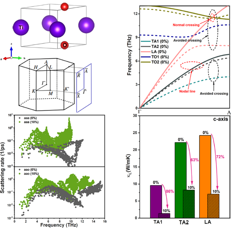 靳鑫博士以“Strain-driven phonon topological phase transition impedes thermal transport in titanium monoxide”为题在《Cell Reports Physical Science》上发表关于拓扑声子态在材料中热输运调控研究工作的最新成果。拓扑量子材料及相关物性引领了凝聚态物理研究的前沿,然而对拓扑声子的应用性研究却鲜有报道。靳鑫博士最新的研究工作中,报道了外尔半金属TiO中拓扑声子态及其对晶格热导率的影响。晶体对称性分析发现,TiO存在两处声子简并态。通过施加单轴应变破坏了受称性保护的拓扑声子态,使得声子支分离,从而增加声子散射率,最终拓扑声子相变导致室温下晶格热导率降低近70%。该研究成果为拓扑声子态在调节拓扑材料的热导率中的重要性提供了直接证据,并为降低热电材料的晶格热导率提供了一个重要的途径。