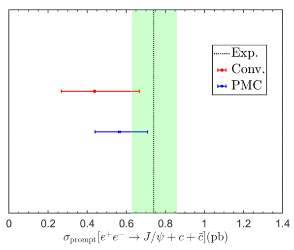 粲夸克偶素物理一直是检验非相对论量子色动力学(NRQCD)有效理论的前沿课题。例如,J/ψ在B工厂中通过正负电子湮灭到双粲的产生,既为人们研究重夸克偶素产生机制提供了机遇,也对NRQCD理论的有效性提出了巨大的挑战。对于单举过程,e+ + e- → J/ψ + c + cbar过程的实验测量结果为0.74pb,比包括了NRQCD领头阶的色单态和色八重态的理论预言(0.1~0.2pb)大了约5倍。当计算了e+ + e- → J/ψ + c + cbar的次领头阶QCD辐射修正后,缩小了理论预言和实验结果之间的差距,验证了理论结果的正确性。但是,由于粲物理能区较为靠近非微扰区域,其微扰展开收敛性不是特别的好,次领头阶截面是领头阶截面的1.8倍左右,并且其次领头阶截面仍然存在较大的重整化能标依赖,e+ + e- → J/ψ + c + cbar的次领头阶预言存在43%-132%的误差范围。本研究基于最大共形原理(PMC)在次领头阶精度下成功消除了此过程的重整化能标不确定性。这一改进使得其总截面的理论预言与Belle实验组的测量结果之间的差距进一步缩小约17%,并且能成功解释动量分布微分截面的实验测量结果。