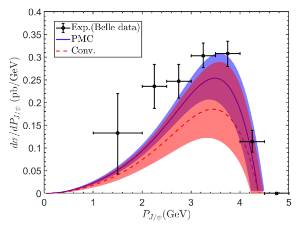图为:PMC能标设定方法和传统能标设定方法下次领头阶微分截面与Belle实验组测量结果的对比