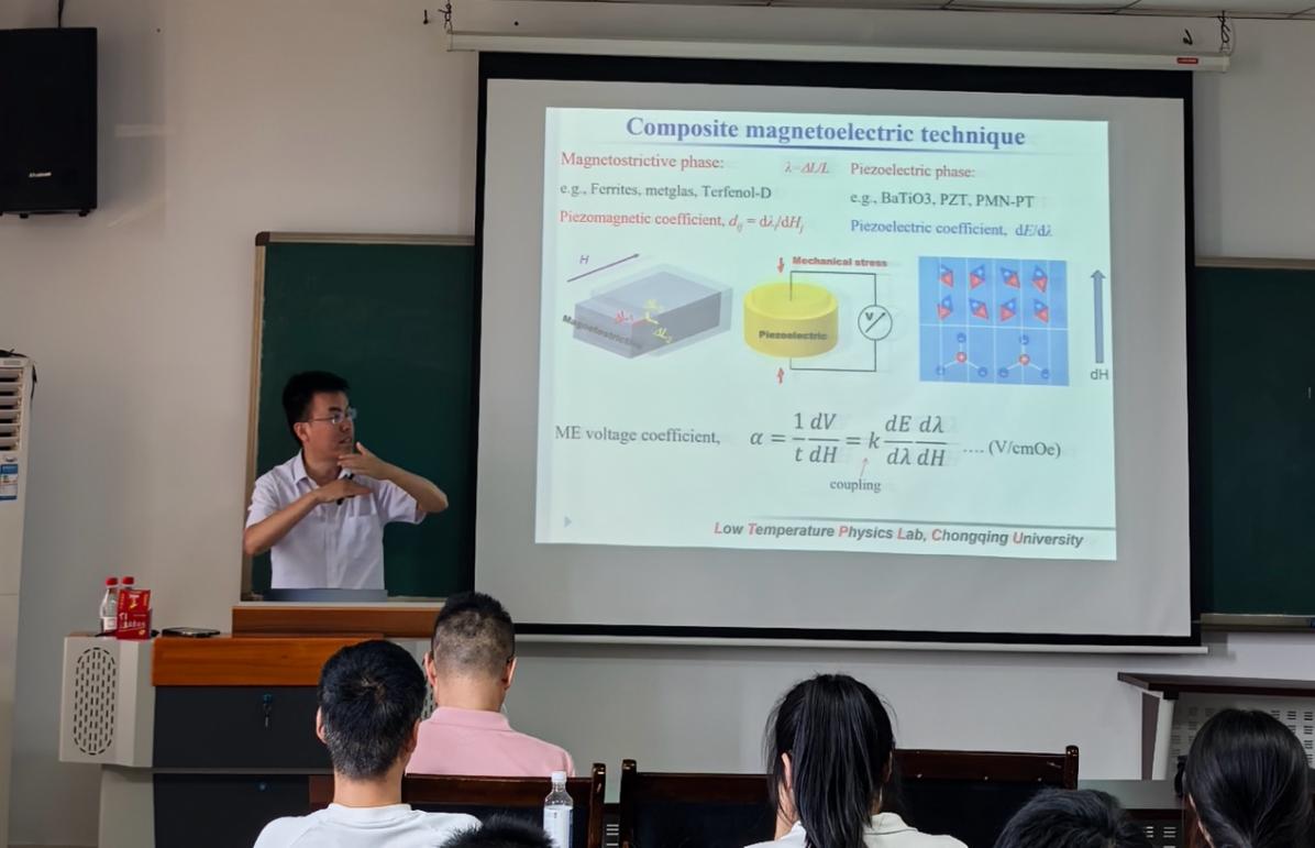 近日,重庆大学量子材料与器件研究中心副主任、国家杰出青年基金获得者、科技创新领军人才孙阳教授和重庆大学物理学院柴一晟教授应邀莅临我校91吃瓜网 开展学术交流活动,分别了题为“磁电学:从基础到应用”和“复合磁电耦合方法:一种普适的超高精度低温强磁场测试技术”的学术报告。本次学术交流活动由教务处副处长毋志民教授主持,物电学院相关专业师生参加